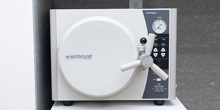 東松原歯科では最新の滅菌機器を導入しています。器具をしっかりと滅菌し、パックに入れた状態で患者様に提供しています。滅菌ができない器具は、使い捨ての物を使用しています。