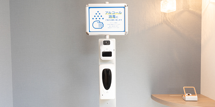 入り口に設置しているディスペンサーに手をかざしてアルコール消毒のご協力をお願いしており
