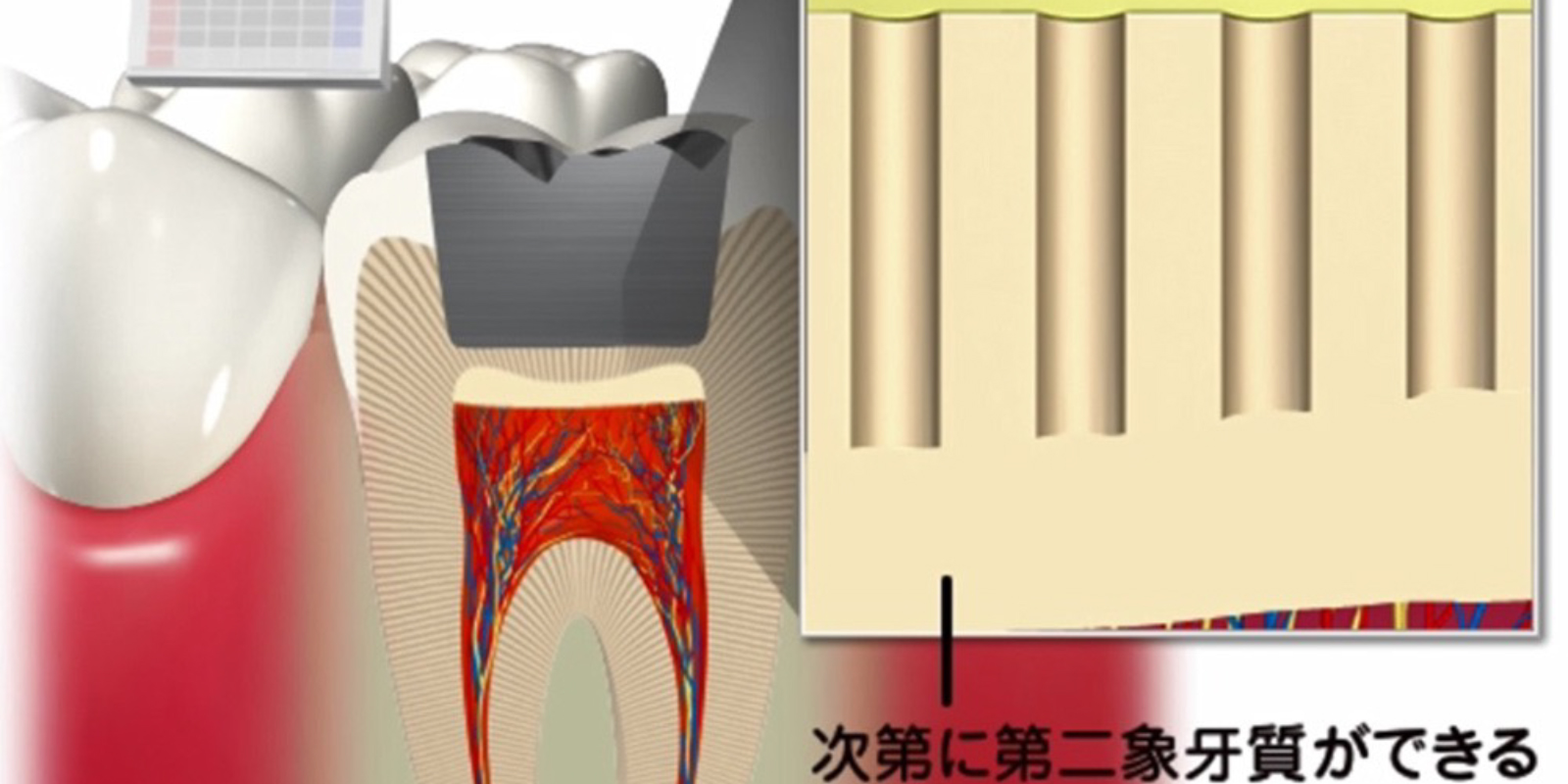 痛みの原因は、詰め物を入れた刺激がほとんどです。当然歯を削れば削るほど神経に近くなり少しの刺激でも痛みを感じます。 しかしこの刺激により歯は防御反応を起こし神経の上層に新たな歯を作ります。これが第二象牙質といわれるものであり神経と詰め物の間に厚みができます。人それぞれこの第二象牙質ができる時間は異なりますがこの厚みにより刺激は伝わりにくくなり痛みが減っていきます。